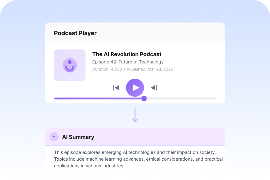 Instantly break down long podcast content into clear summaries, helping you quickly understand the main ideas, highlights, and insights.